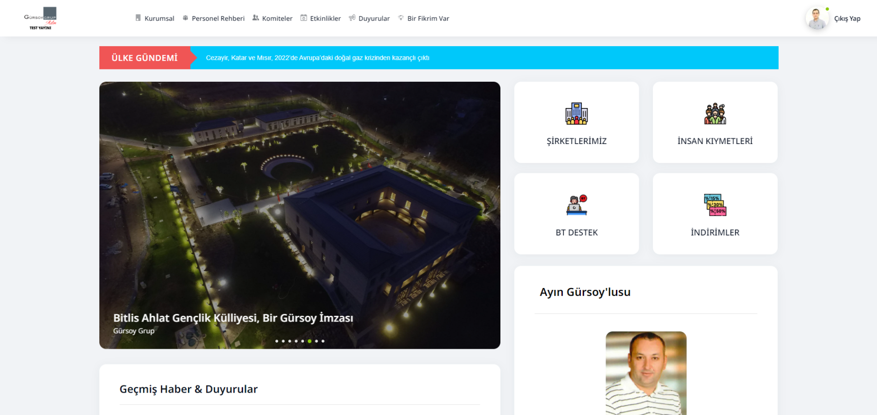 Platformumuzda ayrıca Şirket içi Haberler, Bugün Doğanlar, Yaklaşan Etkinlikler ve daha bir çok uygulamayla Gürsoy Grup Ailem’izden haberdar olabilecekler.