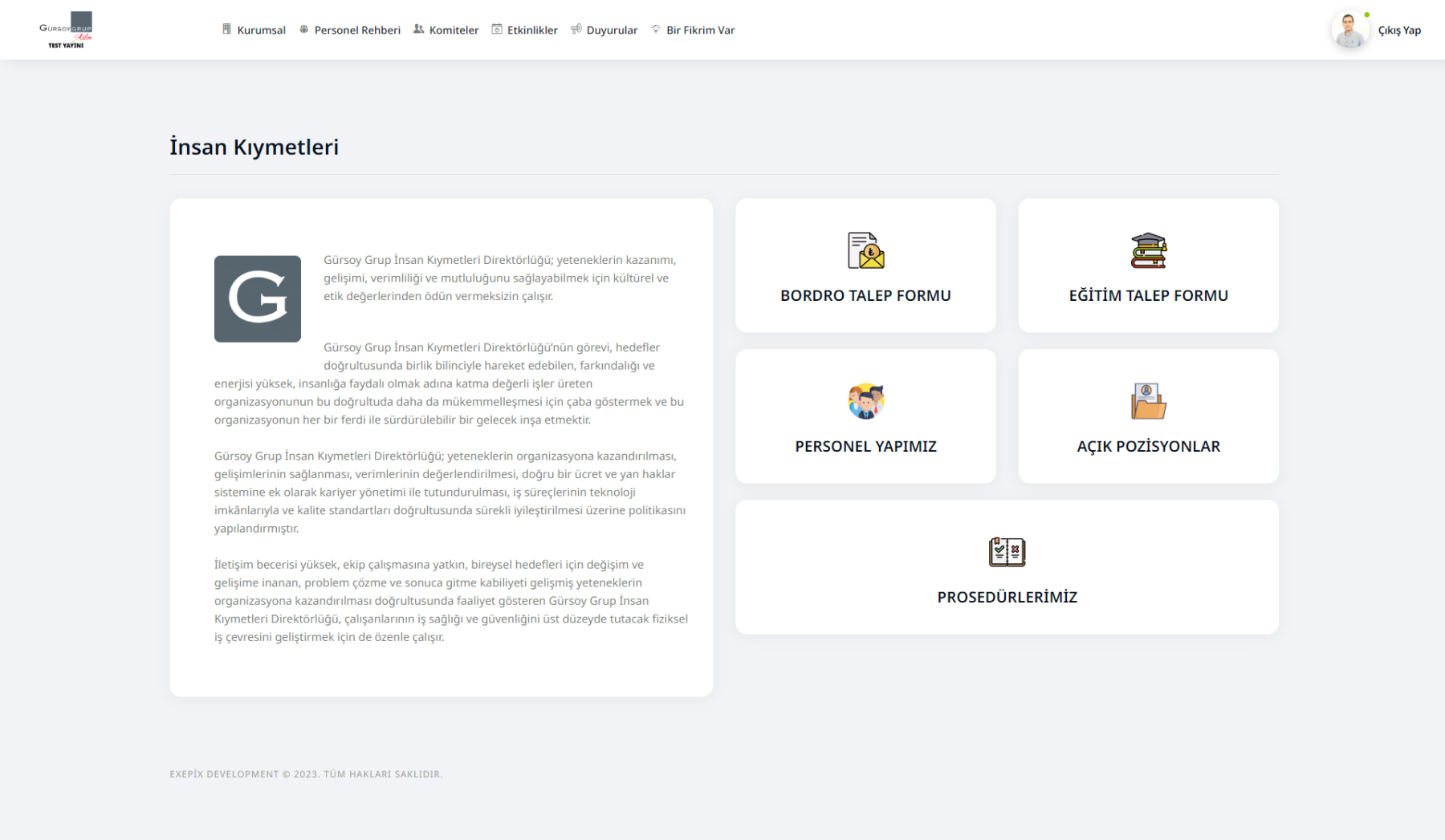 İnsan Kıymetleri sekmesinden Bordro ve Eğitim taleplerini form vasıtasıyla iletebilecekler.